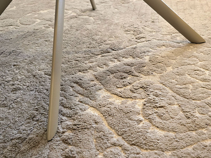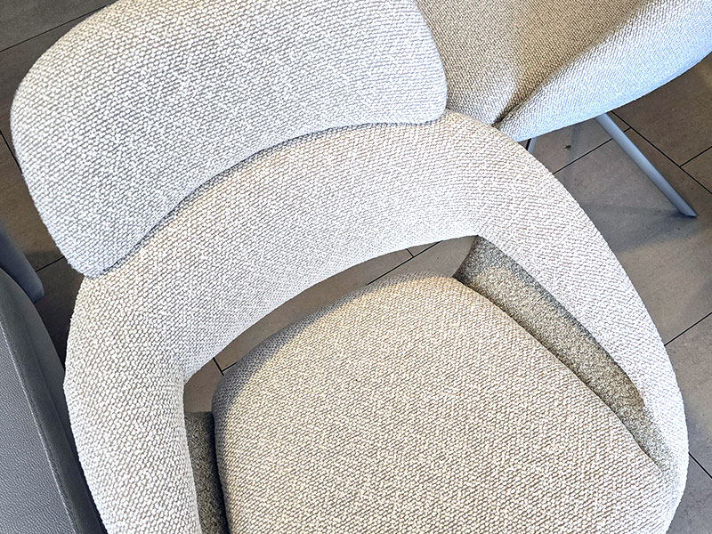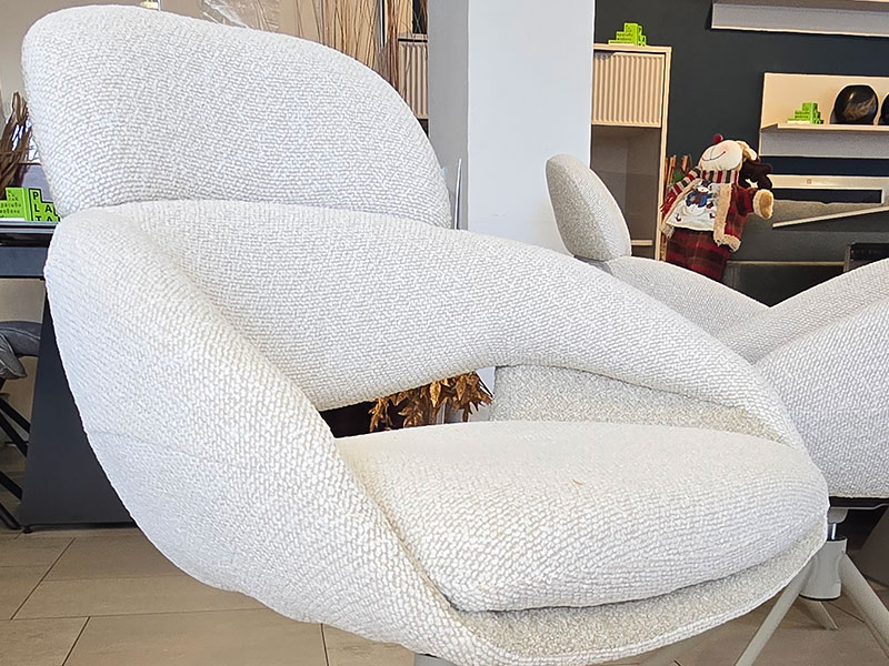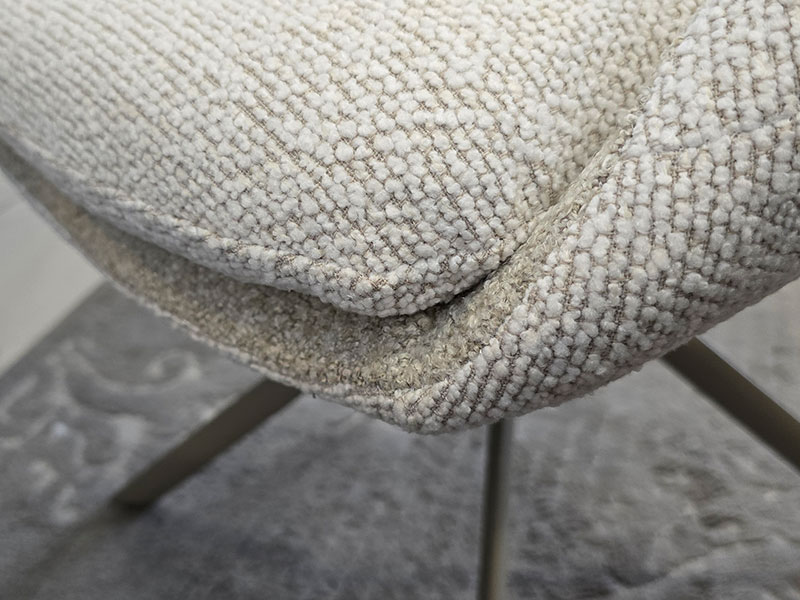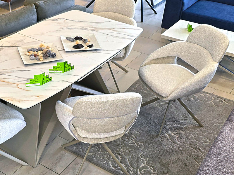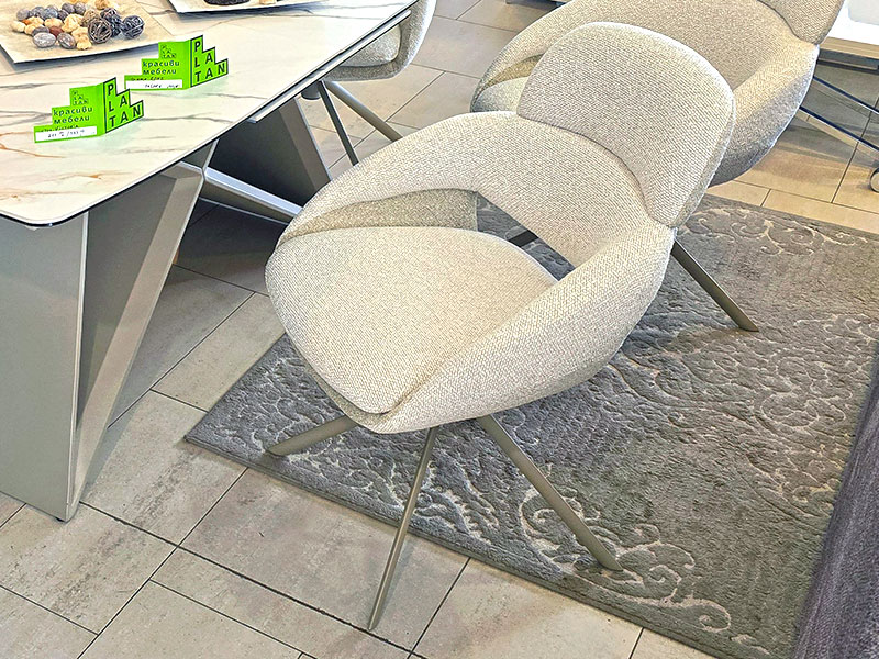 Стол с изключителен дизайн, чиято седалка е изработена от шперплат огънат в сложна форма. Столът е тапициран в два вида плат в бежовата гама, които подчертават интересната форма на седалката. Основата на стола е изработена от метал и е боядисана в модерния цвят каки. Седалката е с функция за въртене на 360 градуса с автоматично връщане в първоначална позиция, което е функция улесняваща значително използването на стола. Цветово много подходящ за комбинация с трапезна маса ROME каки/златен мрамор.