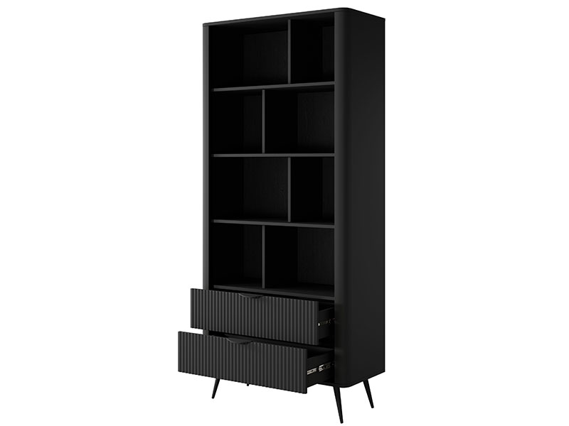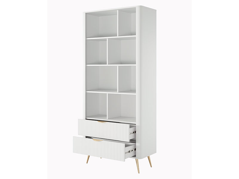 Висока етажерка с две чемеджета в долната част и открити рафтове в горната част. Етажерката е част от модулна система шкафове за обзавеждане на хол и трапезария LANTE, която се произвежда в бял, черен или бежов цвят. При черния цвят краката и дръжките също са в черен цвят. При белия и бежовия цвят, дръжките и краката са в златен цвят. Дизайнът на етажерката е с характерните за цялата система шкафове заоблени ръбове, високи крака и лица с фрезовани вртикални рифели (успоредни релефни канали). Водачите на чекмеджетата са висококачествени – телескопични с пълно изтегляне.
