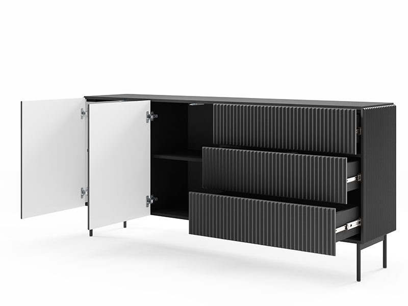 Функционален и стилен скрин с три чекмеджета и две врати, подходящ за хол или трапезария. Дизайнът впечатлява с рифелови фронтове и страници – фрезовани вертикални релефни канали, които придават модерен и елегантен характер. За максимално удобство отварянето на вратите и чекмеджетата става чрез push-бутон механизми, без дръжки, което допринася за изчистената визия. Скринът стъпва на високи метални крака, боядисани в цвета на корпуса, осигуряващи лекота и лесно почистване под него. Предлага се в два актуални цвята – кашмир или черно, които се вписват отлично в модерни интериори.
