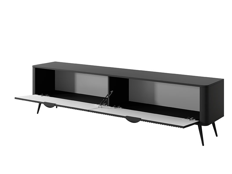 Голям тв шкаф с две отварящи се надолу врати, част от модулна система шкафове за обзавеждане на хол и трапезария LANTE, която се произвежда в бял, черен или бежов цвят. При черния цвят краката и дръжките също са в черен цвят. При белия и бежовия цвят, дръжките и краката са в златен цвят. Дизайнът на тв шкафът е с характерните за цялата система шкафове заоблени ръбове, високи крака и лица с фрезовани вертикални рифели (успоредни релефни канали). Водачите на чекмеджетата са висококачествени – телескопични с пълно изтегляне.