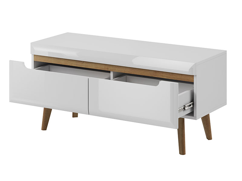 Компактен ТВ шкаф, подходящ за малки дневни или комбинирани помещения. Моделът включва две удобни чекмеджета с фрезовани MDF лица и вкопани дръжки, които осигуряват лесен достъп до съхраняваните вещи. Конструкцията на модула е минималистична, с високи крака, които подчертават леката визия на серията NORDI и осигуряват удобство при почистване под шкафа. Плотът на шкафа е достатъчно широк за телевизори до среден размер, а чекмеджетата позволяват дискретно съхранение на кабели, дистанционни и аксесоари. Предлага се в две красиви цветови комбинации – бял гланц с детайли в дъб артисан или дъб артисан с елегантни черни акценти.
