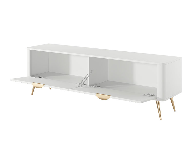 Малък тв шкаф с две отварящи се надолу врати, част от модулна система шкафове за обзавеждане на хол и трапезария LANTE, която се произвежда в бял, черен или бежов цвят. При черния цвят краката и дръжките също са в черен цвят. При белия и бежовия цвят, дръжките и краката са в златен цвят. Дизайнът на тв шкафът е с характерните за цялата система шкафове заоблени ръбове, високи крака и лица с фрезовани вертикални рифели (успоредни релефни канали). Водачите на чекмеджетата са висококачествени – телескопични с пълно изтегляне.