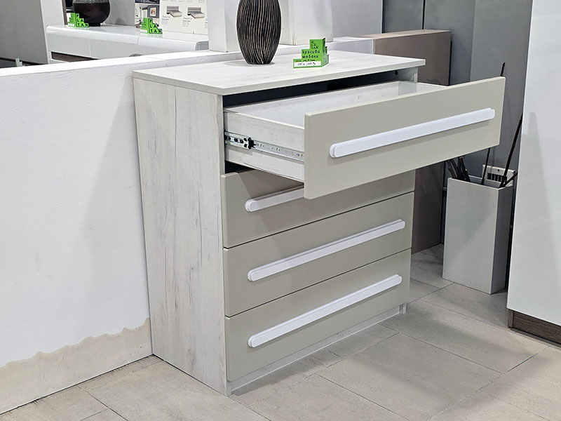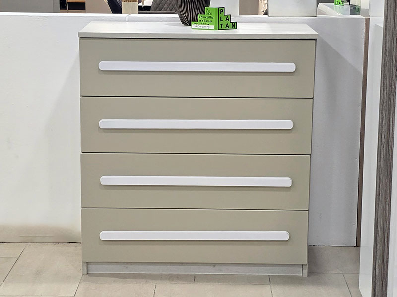 Намаление на скрин с четири чекмеджета модул 10 от модулна система ZARRA. Скринът е мостра в магазинът ни на ул. Генерал Стефан Тошев, 1-9 в гр. София. Лицата и дръжките са изработени от MDF, а корпусът от ламинирани ПДЧ.