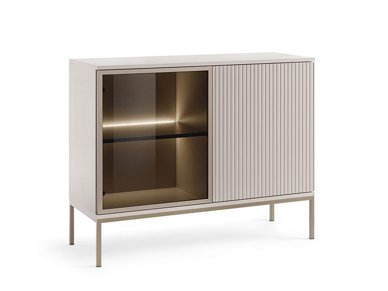 Нисък шкаф, който е идеален избор за тези, които търсят компактно, но стилно решение за съхранение на вещи. Той комбинира характерните дизайнерски елементи на серията SENTO — изящна витрина със затъмнено стъкло, вертикален релеф върху едната врата и вградено LED осветление, създаващо топла и приятна атмосфера.