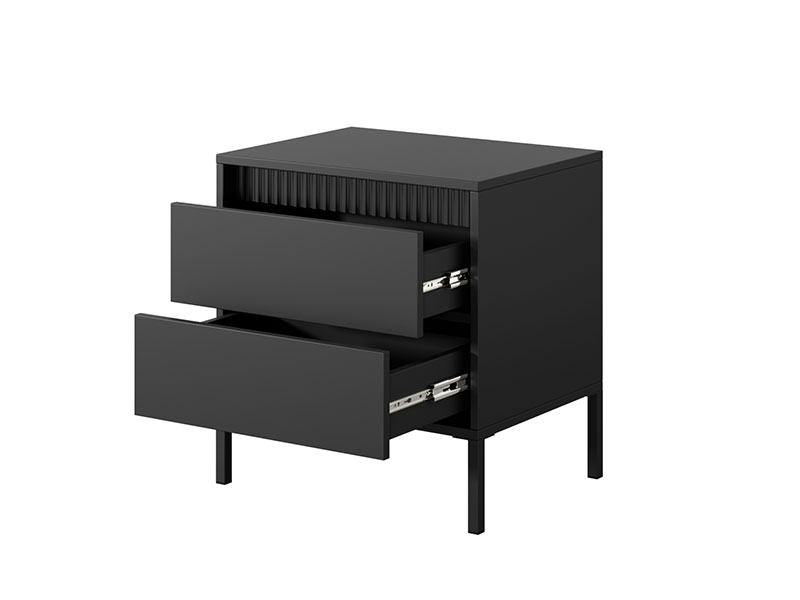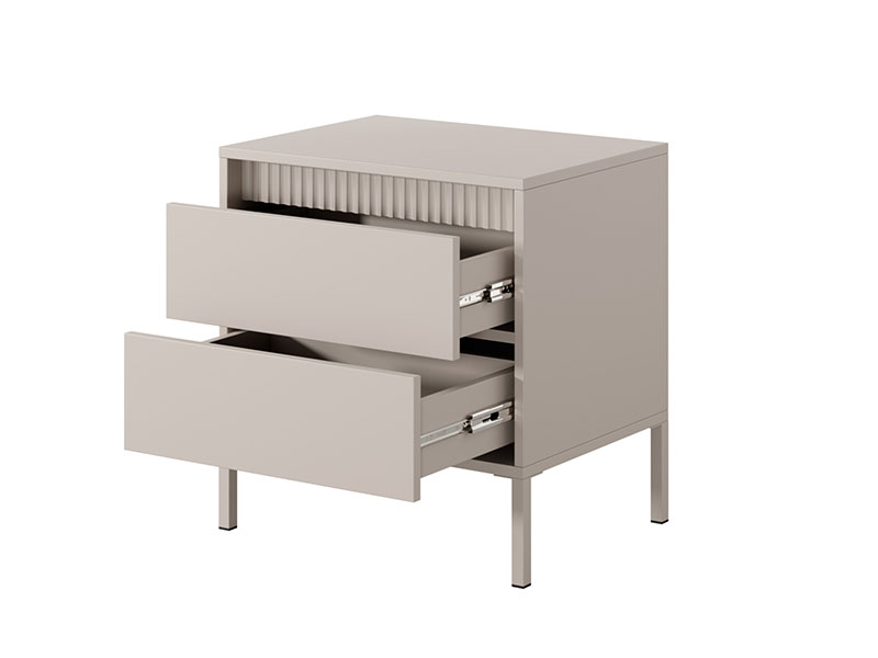 Нощно шкафче с две чекмеджета, кето се изработва в два цвята: черно или бежово. Лицето е с харакререн дизайн, при който в горната част има тясна ивица с вертикално фрезован растер. Краката са метални и достатчъно високи за лесен достъп за почистване под шкафа. Боядисани са в цвета на корпуса. Отварянето става чрез пуш-бутони чрез лек натиск върху челата на чекмеджетата.