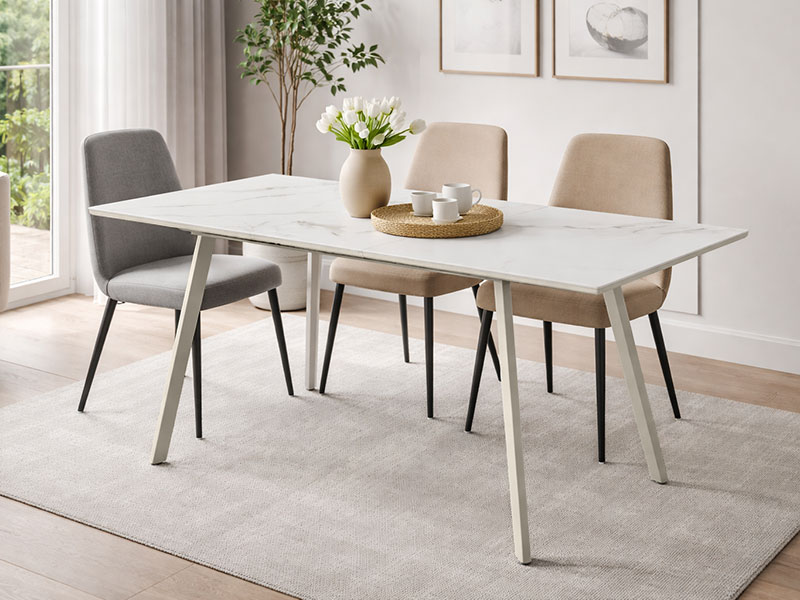 Малка разтегателна трапезна маса с размер много подходящ за повечето апартаменти в България. Масата е с плот изработен от MDF, върху който е залепена керамика от най-висок клас. Цвета на керамиката е мрамор със златисти жилки с гланцов финиш, който е подбран специално да си подхожда много добре с бежовия цвят на краката на масата. В сгънато състояние размерът на плота на масата е 140х80 см, а като се разгъне става 180х80 см. В сгънато състояние може да се използва комфортно от шестима души, а в разгънато от осем. Цялата основа е изработена от метал, което прави масата изключително стабилна и здрава (освен краката, и рамката, за която е захванат плота е изработена от метал). Повърхността на плота е защитена от еисокия клас керамика, който е много устойчив на въздействието на вода, UV лъчение и механични повреди. Предлагаме модела и с черна основа и с плот от бял мрамор – трапезна маса NANCY керамика с черна основа.