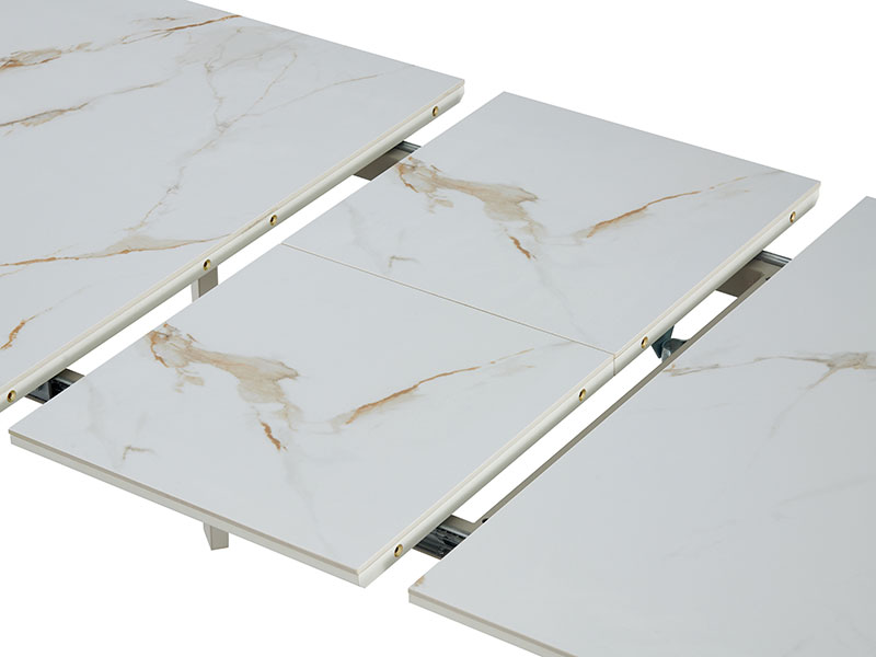 Начало » Трапезария » Трапезни маси » разтегателна трапезна маса NANCY керамика с бежови крака и плот в златен мармор