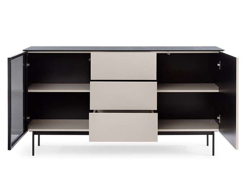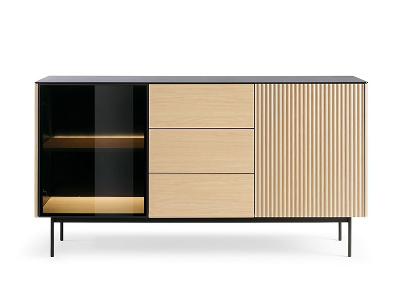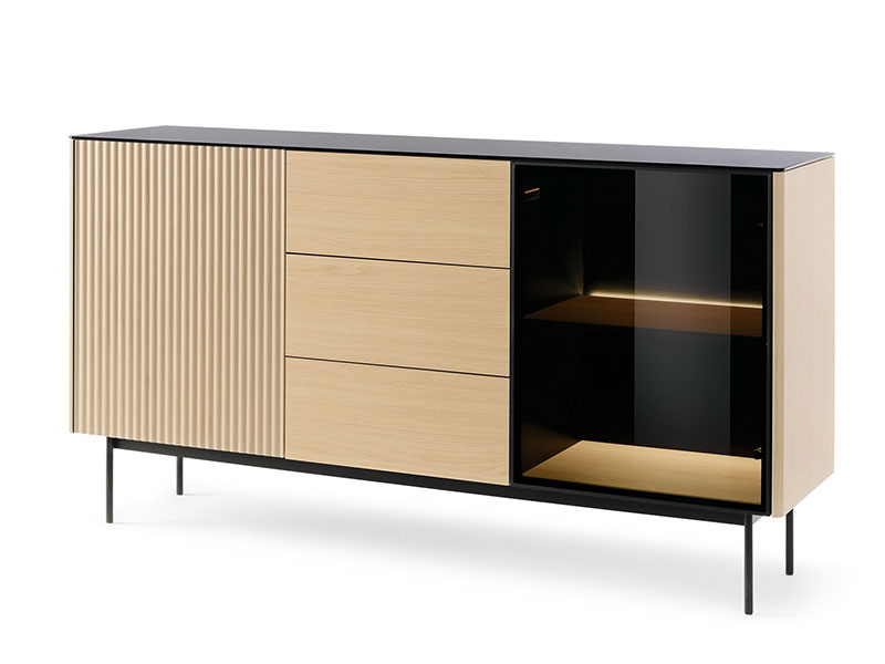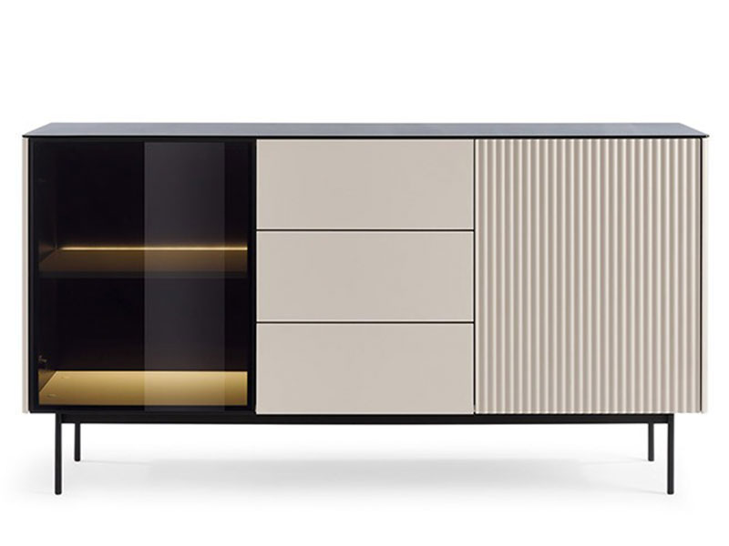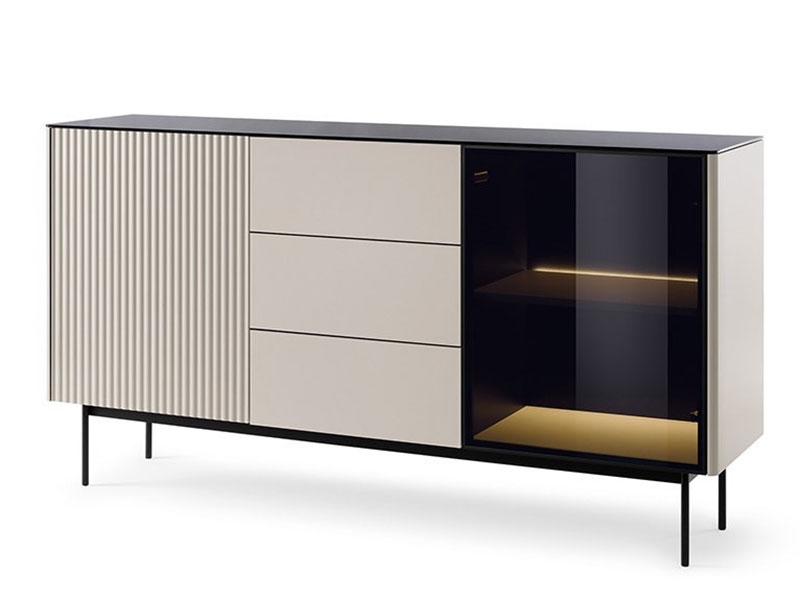Шкаф с две врати и три чекмеджета, част от модулна серия шкафове ORTA. Лицата на чекмеджетата са плътни с гладка повърхност, докато едната врата е изработена от MDF фрезован във вертикален растер, а другата е със стъклена витрина. Витрината е с рамка изработена от алуминий в черен цвят и пълнеж от затъмнено и закалено стъкло. Зад витрината има рафтове и вградено LED осветление, което е включено в цената на шкафа. Таванът на шкафа е изработен от съкло боядисно в черен цвят. Страниците са със заоблени предни ръбове. Краката са изработени от метал боядисан в черен цвят и са високи. Поради дизайнът без дръжки, отварянето и затварянето на чекмеджетата и вратите става посредством пуш-бутони. Чекмеджетата са свисококачествени телескопични водачи с пълно изтегляне. Възможен в два цвята, които са на една и съща цена: кашмир и дървесен декор дъб винченца.