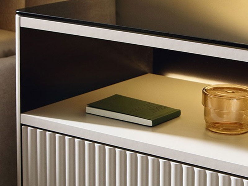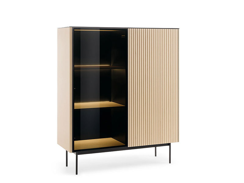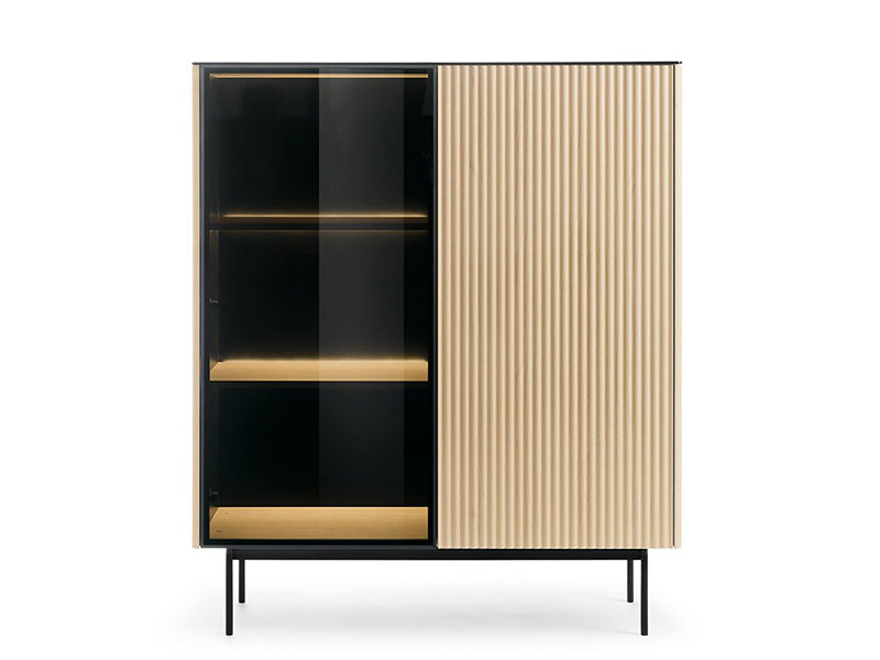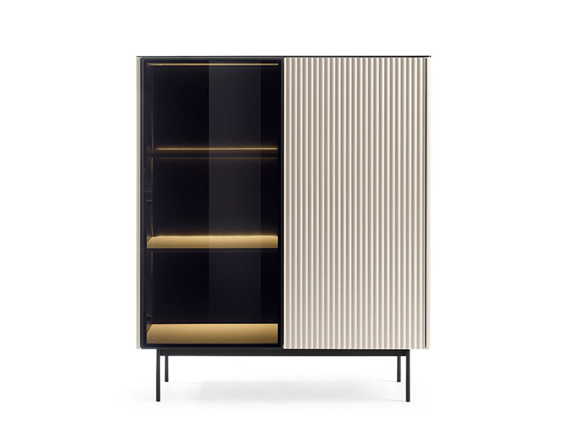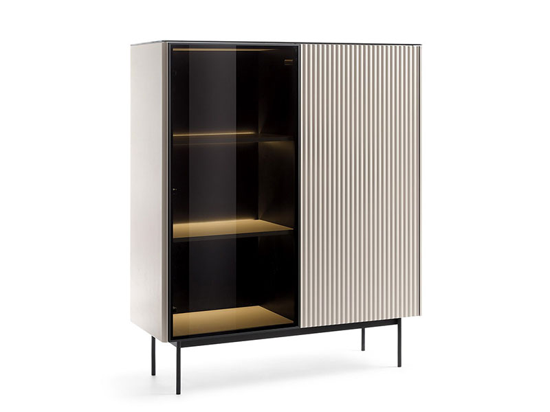 Шкаф с две врати, част от модулна серия шкафове ORTA. Едната врата на шкафът е с витрина, а другата е плътна. Витрината е с рамка изработена от алуминий с антисолно стъкло, което е затъмено и закалено. Плътната врата е изработена от MDF, който е фрезован с вертикален растер. Зад витрината има вградено LED осветление, ковто е включено в цената. Таванът на шкафа е изработенм от черно стъкло. Предните ръбове на страниците са заоблени. Краката са метални и високи, боядисани в черен цвят. Дизайнът е без дръжки и отварянето става чрез пуш-бутони. Възможен в два цвята, които са на една и съща цена: кашмир и дървесен декор дъб винченца.