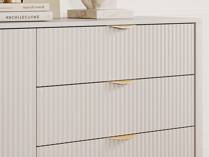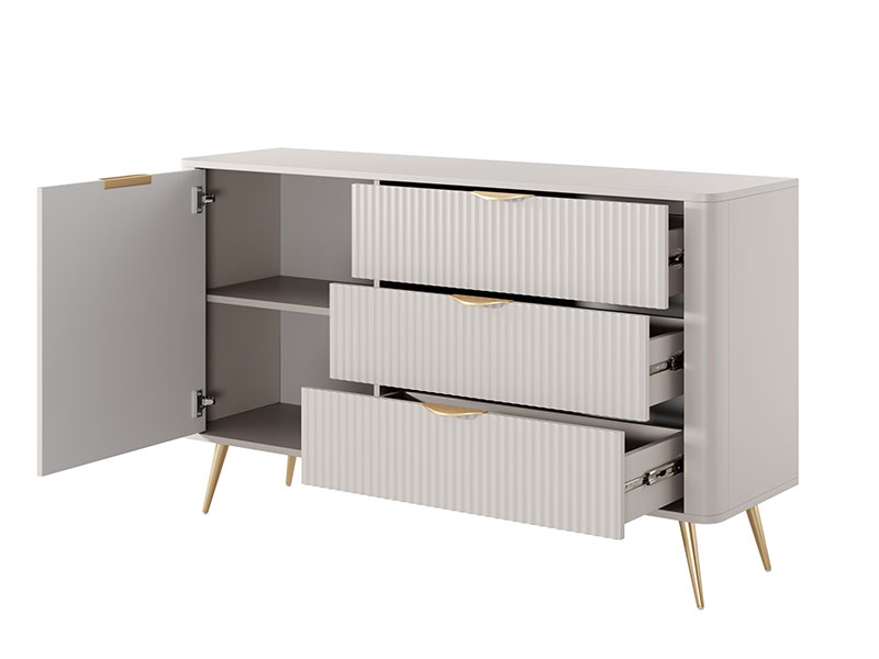 Малъл скрин с една врата и три чекмеджета, част от модулна серия мебели LANTE, която може бъде изработена освен в бежов и в бял или черен цвят. Скринът е с характерният за серията дизайн със заоблени ръбове, лица с вертикален релефен растер и крака и дръжки в златен цвят. Водачите са телескопични с пълно изтегляне. Цветът е бежово.