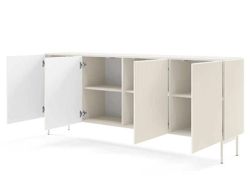 Скринът MUTI с четири врати впечатлява с модерен и изчистен дизайн, подчертан от фрезованите рифелови вертикални линии върху лицата и страниците. Шкафът стъпва върху високи метални крака, боядисани в цвета на корпуса, което създава усещане за лекота и осигурява лесен достъп за почистване под него. Вратите са без дръжки, оборудвани със скрити push-бутон механизми, които позволяват удобно и плавно отваряне с едно докосване. Благодарение на елегантната си визия и практичността, скринът е подходящ избор както за хол, така и за трапезария. Възможен в два цвята: кашмир или черно.