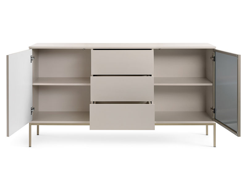 Скринът предлага перфектен баланс между елегантна визия и висока функционалност. Той е изработен с две врати — едната с вертикален релефен растер, а другата с остъклена витрина от затъмнено стъкло, вдъхновена от естетиката на модерния интериор. В средата между вратите са разположени три чекмеджета, изработени в цвета на корпуса, които осигуряват допълнително пространство за дребни вещи, текстил и аксесоари. Зад всяка от вратите има по един рафт, които улесняват оптималната организация при съхранението на вещи. LED осветлението във витрината подчертава премиум характера на модела, а високите метални крака гарантират стабилност и визуална лекота. Двата налични цветови варианта — черен корпус с дъб вотан или кашмир с бронз — позволяват лесно адаптиране към различни стилистики. Скринът е изключително подходящ за големи дневни, трапезарии или спални, където е необходима естетична мебел с богата функционалност.