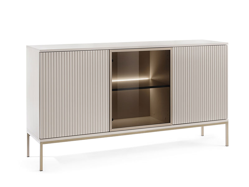 Модерен и функционален скрин с три врати, като средната е с остъклена витрина от затъмнено стъкло, а двете крайни са с характерния за модел SENTO вертикален релефен растер. Зад всяка от трите врати има по един рафт, позволяващ удобно съхранение на вещи. Вграденото LED осветление зад витрината придава на скрина допълнително усещане за дълбочина и премиум стил, правейки го идеален акцент във вашата дневна или трапезария. Зад витрината можете да изложите декоративни предмети, които да изпъкват дискретно благодарение на красивото осветление. Моделът стъпва върху високите, ефирни метални крака, характерни за серията, които придават лекота на дизайна и осигуряват практичност при почистване. Те едновременно допринасят за модерния вид на скрина и гарантират стабилната му конструкция. Скринът се предлага в две цветови комбинации: