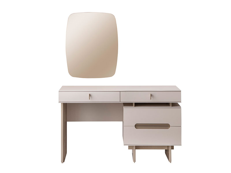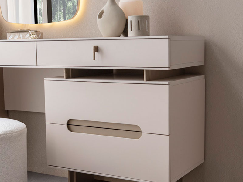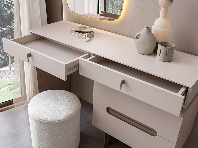 Елегантна тоалетка с огледало с вградено LED осветление, създадена за модерен и функционален интериор. Корпусът е изработен от висококачествено ПДЧ, а лицата – от боядисан MDF, което гарантира дълготрайност, стабилност и стилна визия. Тоалетката е в изключително актуалния цвят кашмир – елегантен сиво-бежов нюанс, който се съчетава лесно с различни стилове обзавеждане и придава усещане за уют и лукс. Моделът разполага с практичен контейнер с две чекмеджета, както и с още две чекмеджета под плота, осигуряващи достатъчно място за съхранение на козметика, аксесоари и лични вещи. Чекмеджетата са снабдени с висококачествени телескопични механизми с пълно изтегляне, които осигуряват тиха и комфортна употреба. Дръжките на чекмеджетата на контейнера са вкопани, с овална форма, а тези под плота са метални, което подчертава модерния дизайн. В цената е включено огледало за окачване на стена с LED подсветка, което осигурява допълнително меко осветление. Тоалетката е част от спалня MALDIVES, в която са включени още легло, нощни шкафчета и гардероб.