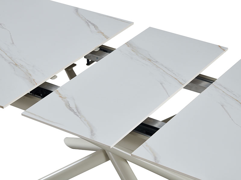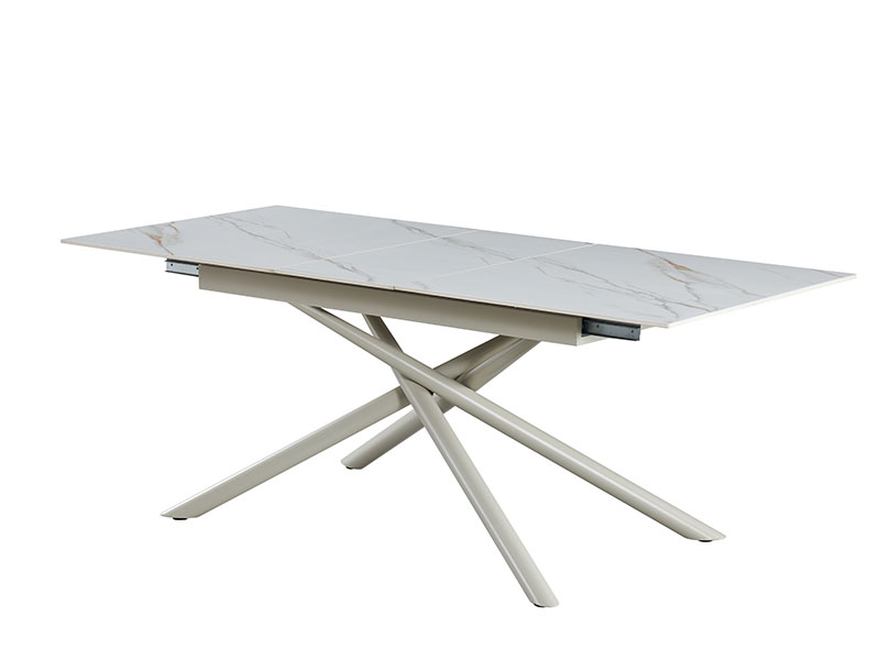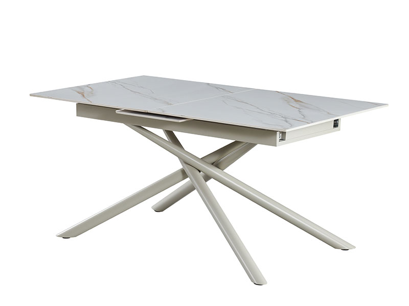 Разтегателна трапезна маса с основа изработена от метал и плот изработен от синтерован камък. Краката са с много интересен и неконвенционален дизайн, при който четири конусни тръби (стесняващи се в горния си край) се преплитат в красива структура. Разтягането става със синхронен механизъм, при който с изтегляне на която и да е страна на плота, разтежението разположено в средата, се показва и повдига до нивото на основните плотове. В неразтегнато състояние размерът на плота на масата е 160х90 см, което позволява да се използва от до 6 души. В разтегнато състояние плотът става с размери 200х90 см, което позволява използването и от до 8 души. Разбира се в случая използваме правилото, че за да може да бъде удобно, за всеки човек трябва да има поне 60 см от дължината на плота. Разбира се при нужда, на масата могат да се настанят и повече хора. Благодарение на подбраните материали: метал и керамика, в съчетание с качествената изработка, масата е изключително здрава и надеждна. Синтерованият камък е висок клас керамика, при който при процеса на производство, освен високи температури, се прилага и високо налягане за още по-добра адхезия между частиците на материала. Устойчив е на вода, влага, топлина, надраскване и UV лъчение.