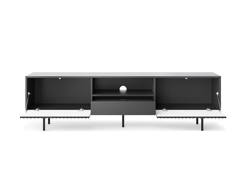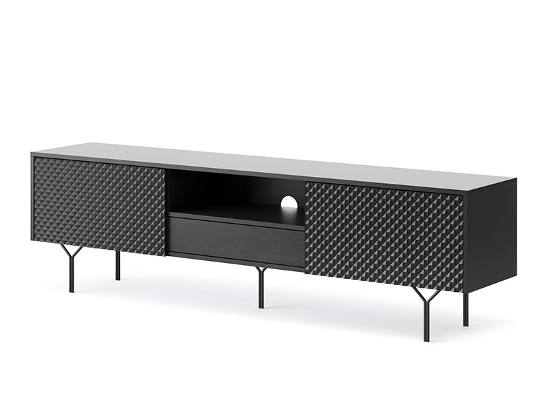 ТВ шкаф част от серията от шкафове за обзавеждане на всекидневна и трапезария – RAVEN. Характерните за серията лица с 3D релеф са налични и тук, както и тъмните цветове и интереснте метални крака. Шкафът е с едно чекмедже в средата и ниша над него и с две врати в двата края. Корпусът и лицата на чекмеджетата са с много тъмен, почти черен цвят дървесен декор.