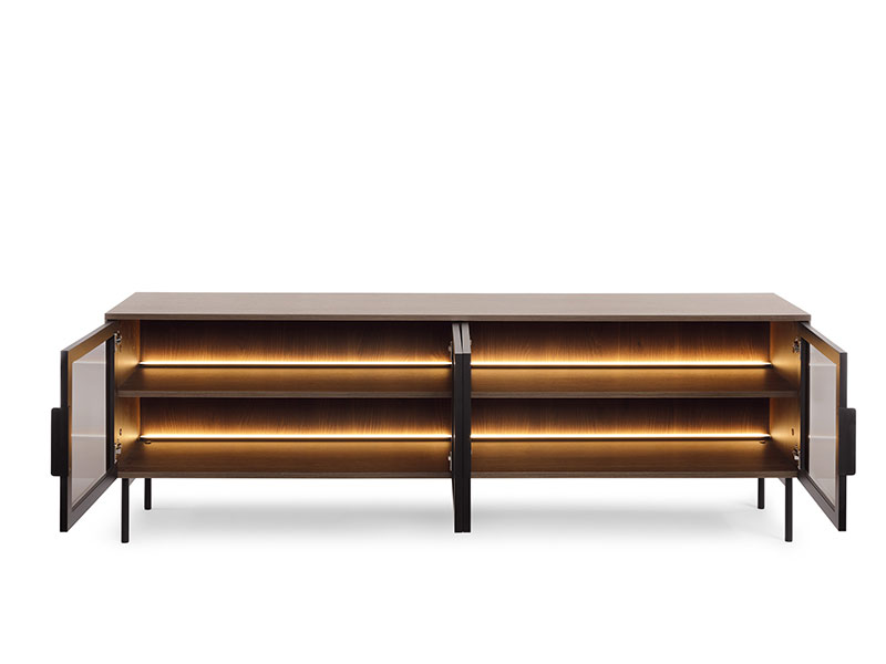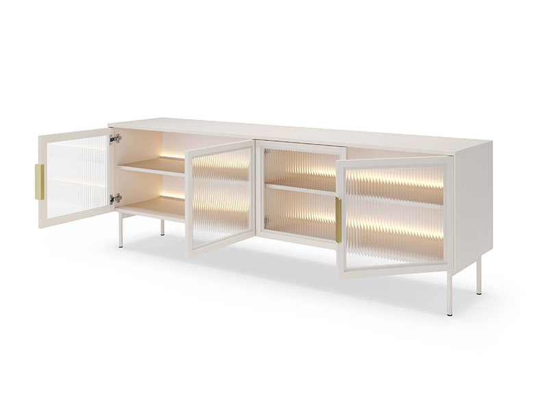 ТВ шкаф с четири остъклени врати, част от серия модулни шкафове за хол и трапезария модел LUMI. Зад вратите има LED осветление, което е включено в цената. Предлага се в две цветови комбинации: кашмир или дъб с черно. При цветовата комбинация кашмир в този цвят са всички елементи на шкафоа освен дръжките, които са в златен цвят. При цветова комбинация дъб с черно, в дъб е само корпуса, а рамките на вратите, краката и дръжките са в черен цвят. Краката са мет6ални и достатъчно високи, така че почистването под шкафовете да става лесно.
