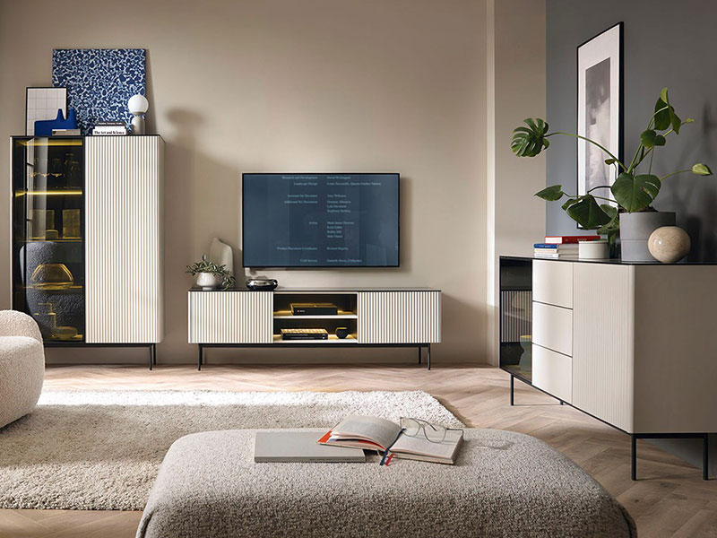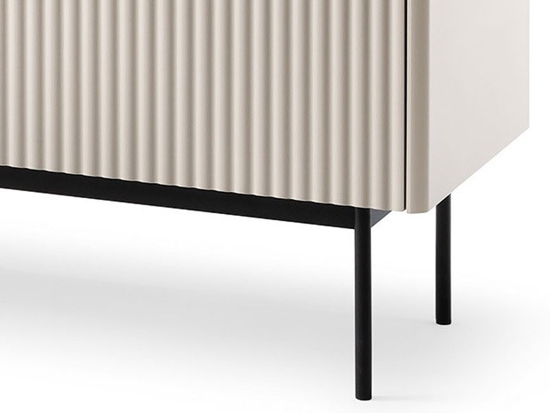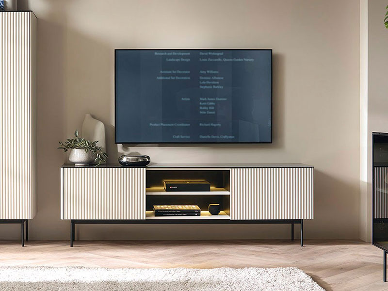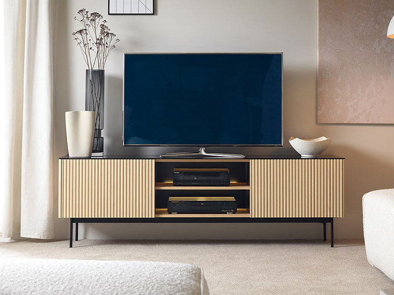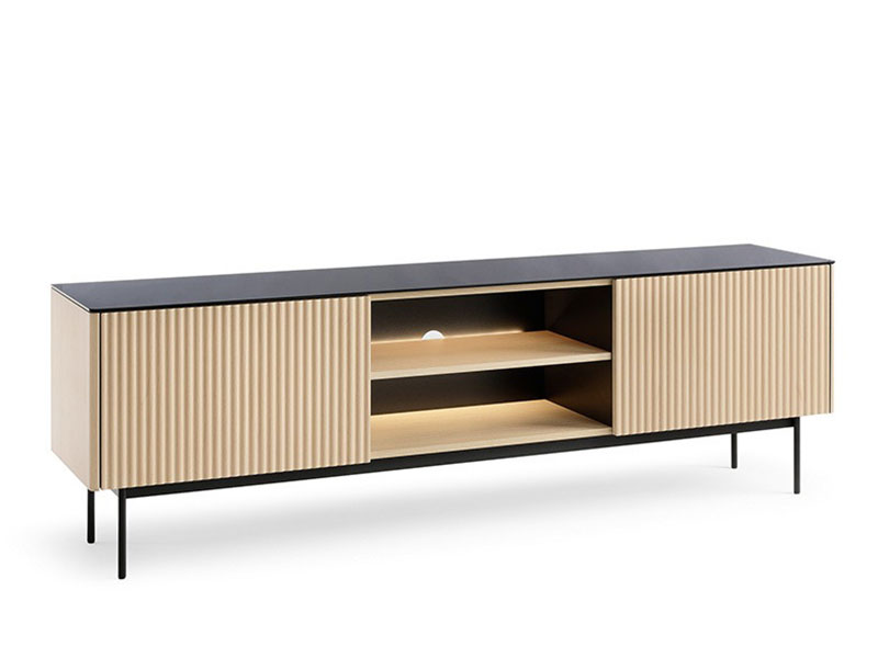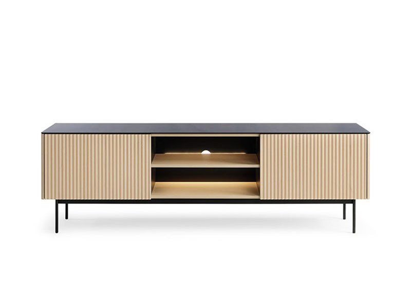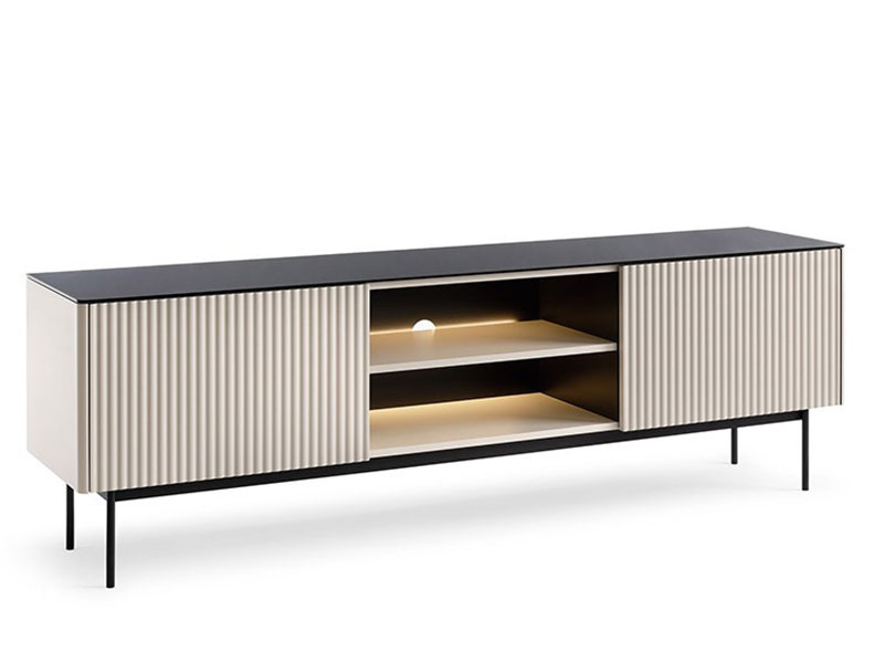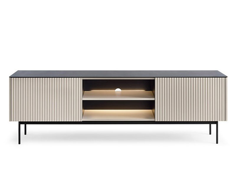 Телевизионен шкаф, част от серията шкафове за обзавеждане на хол и трапезария ORTA. Между вратите на шкафа има ниша на две нива, в която може да се поставя техника. В нишата има вградено LED осветление, което е включено в цената на телевизионния шкаф. Вратите са изработени от MDF, фрезован на растер вертикално. Таванът на тв шкафа е изработен от стъкло боядисано в черен цвят. Страниците са ъс заоблени предни ръбове. Краката са високи, метални, боядисани в черно. Отварянето на вратите е бездръжково – с пуш-бутони. Възможен в два цвята, които са на една и съща цена: кашмир и дървесен декор дъб винченца.