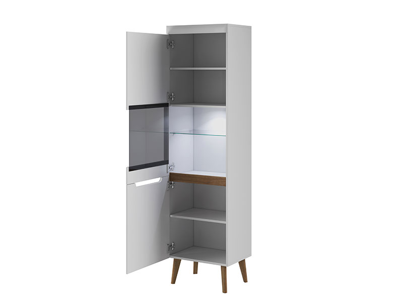 Висок шкаф, при който долната врата е плътна, а горната е със стъкло. Подходящ е за съхранение на големи предмети, посуда и декоративни елементи. Високата конструкция използва ефективно вертикалното пространство, а елегантният дизайн с MDF лица с вкопани дръжки се вписва отлично във всяка модерна дневна или трапезария.
